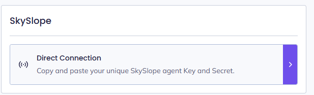 - Agents will connect their own account using an API Key and Secret generated in SkySlope.