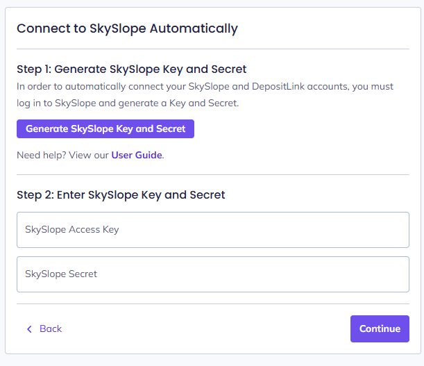DepositLink will redirect you to SkySlope, where you can generate API credentials.